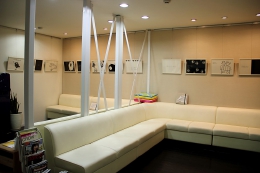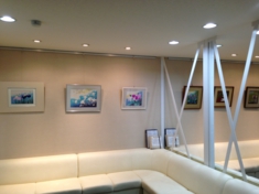 当クリニックでは待合室を中心とした院内を興味のある方に開放して小作品展を定期的に開催できたらと設計の段階から考え、院内のほとんどの壁にはピクチャーレールを設置し、ライティングもそれにあわせて考えてもらいました。