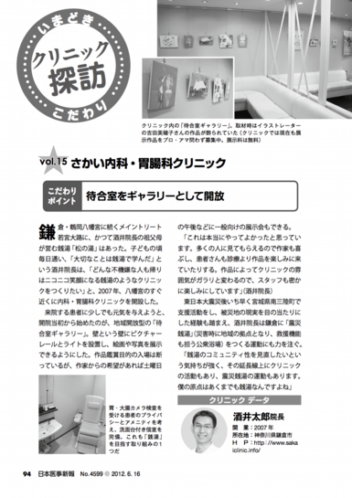 当院の待合室ギャラリーの記事が医事新報2012年6月16日号「いまどき こだわり クリニック探訪」のコーナーに掲載されました。(クリックにて拡大)