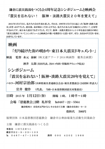 震災から20年の被災地で、借り上げ復興住宅の強制明け渡しが行われようとしていたりと、ある面では深刻になってきている被災地の現実を伝えるため兵庫県被災者連絡会会長の河村宗治郎さんをお呼びし、「鎌倉に震災銭湯をつくる会4周年イベント」を開催します。